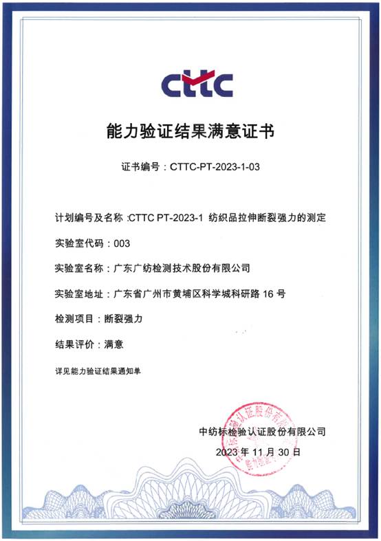 近日,廣東廣紡檢測技術(shù)股份有限公司收到參加中紡標(biāo)檢驗(yàn)認(rèn)證股份有限公司組織的“紡織品拉伸斷裂強(qiáng)力的測定”和“紡織品耐洗色牢度的測定”能力驗(yàn)證結(jié)果滿意通知。